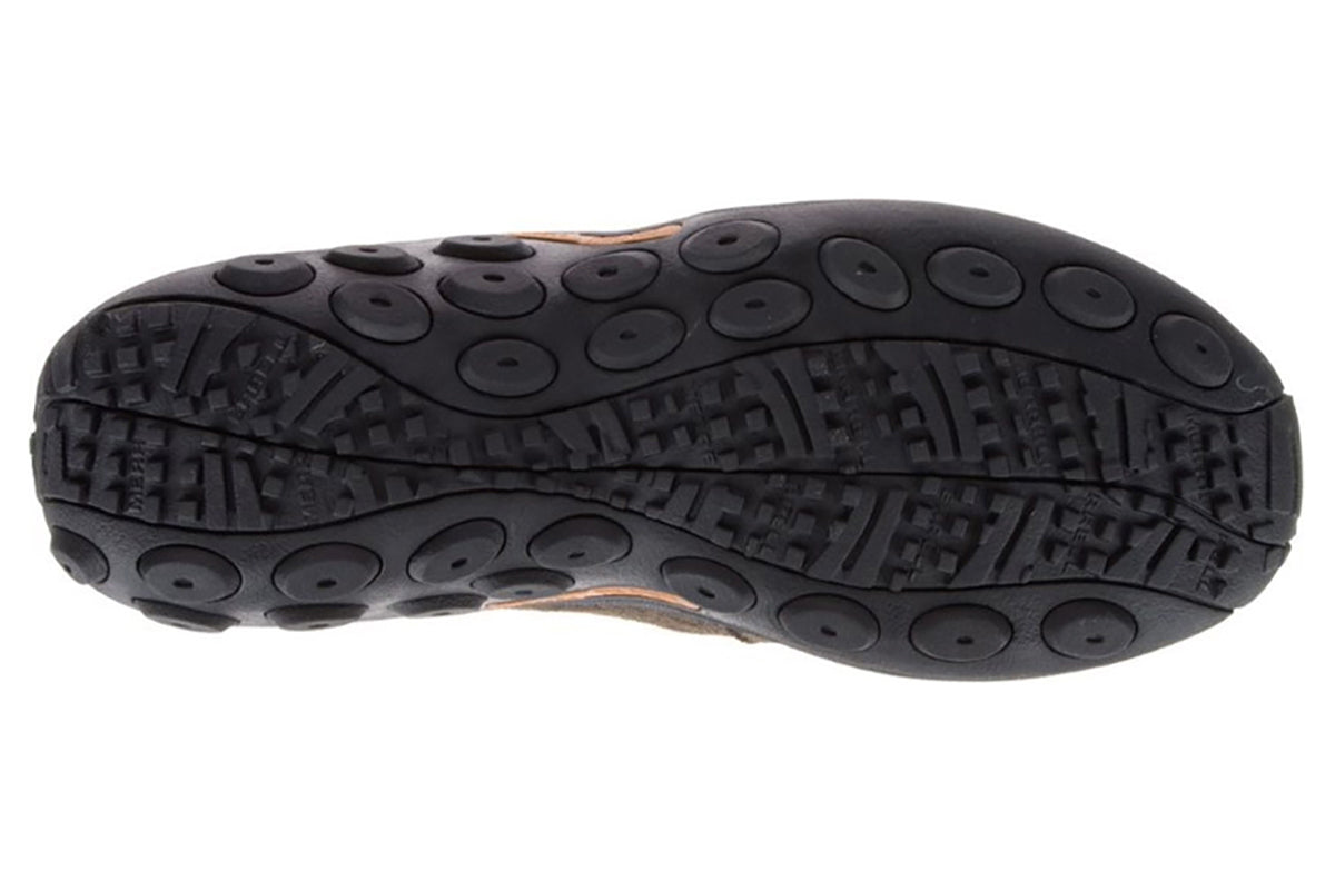 The Jungle Moc slip-on shoe blends style and comfort for your adventures. Its suede leather upper offers a sleek look, while the compression-molded EVA footframe cushions your steps. The Merrell air cushion in the heel absorbs shock and adds stability, ensuring a smooth ride.